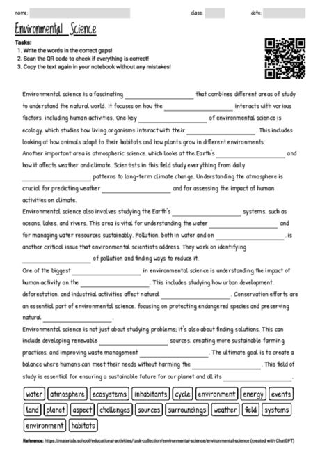 Cloze texts like this are excellent tools for teaching environmental science. They encourage active reading and help students identify and understand key concepts and terms. By filling in the gaps, learners engage intensively with the text content, which strengthens memory and understanding of the topic. This specific text provides a comprehensive overview of various aspects of environmental science and can be used in different phases of the lesson. It is suitable as an introduction to the subject, for consolidating previously learned content or for reviewing knowledge. The clear and simple language makes the text particularly suitable for younger pupils. It also encourages critical thinking and discussion about human intervention in nature and its consequences.